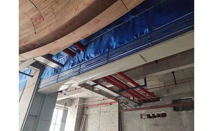 擋煙垂簾垂壁根據設計要求和現場實際情況采取如下施工順序:首先,搭設腳手架一放線一打眼--上脹栓一焊骨架。第二,吊件一安裝骨架…